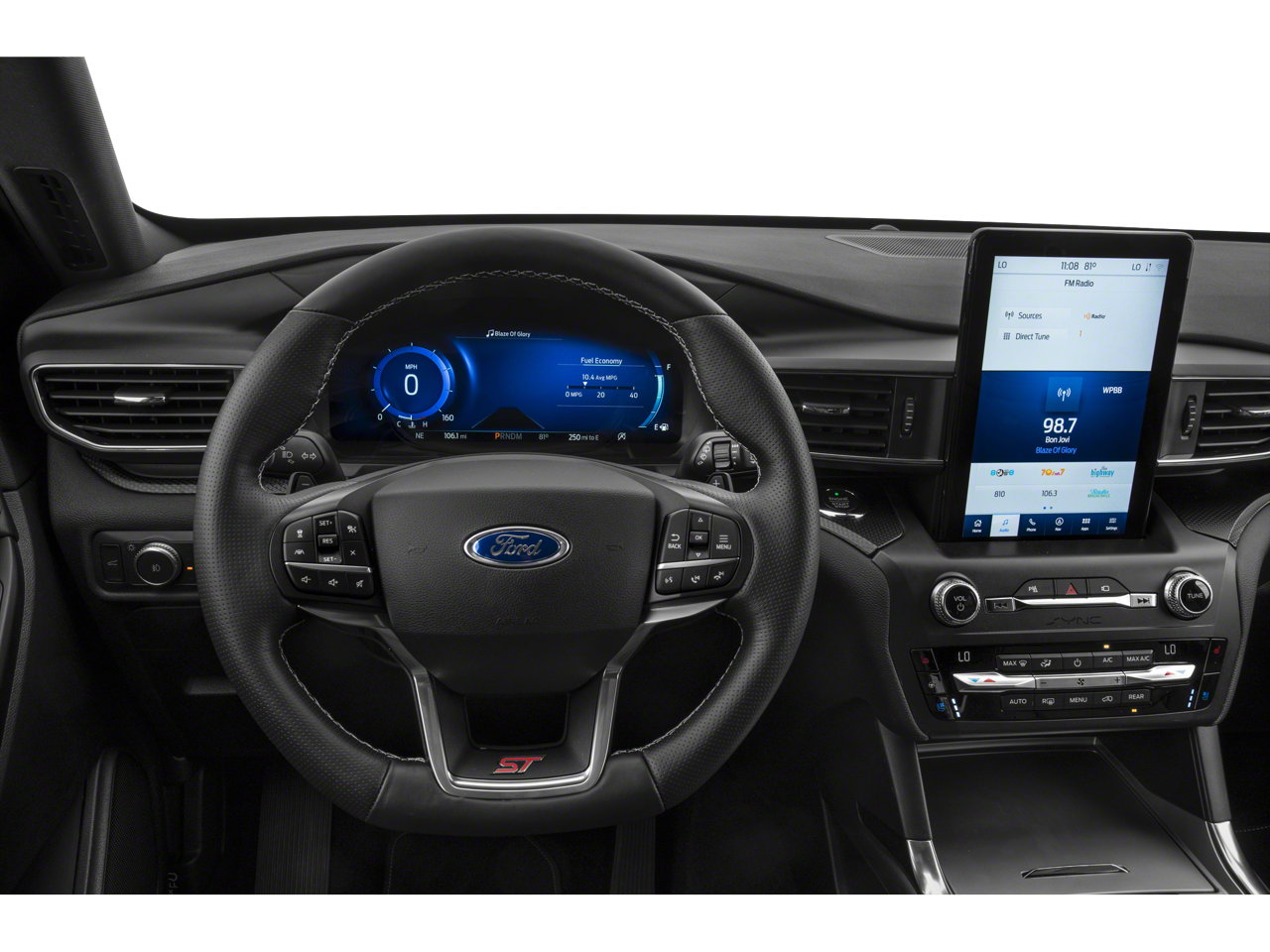 EQUIPMENT GROUP 401A ST High Package, ambient lighting, Memory Drivers Seat, Power Tilt/Telescoping Steering Column, Front Rain-Sensing Wipers, Hands-Free Foot-Activated Liftgate, Reverse Brake Assist, 360-Degree Camera w/Split View, Wireless Charging Pad, 110V/150W AC Power Outlet, Replaces the powerpoint port on the rear side of the center floor console, Radio: B&O Sound System by Bang & Olufsen, MP3 capability, 12 speakers, subwoofer, HD Radio, speed-compensated volume and SiriusXM radio w/a 3 month prepaid subscription, Service is not available in Alaska and Hawaii, Sideview Mirrors w/Gloss Black Caps, power-folding w/Autofold, power and heated glass, LED turn signal indicators, ST projection lamps, drivers side auto-dimming and driver and passenger side memory, Ford Co-Pilot360, TWIN PANEL MOONROOF remote control front windows (opens front windows from outside of the vehicle via the key fob), TRANSMISSION: 10-SPEED AUTOMATIC (STD), HANDS-FREE LIFTGATE DELETE. Ford ST with Forged Green exterior and Ebony interior features a V6 Cylinder Engine with 400 HP at 5500 RPM*.